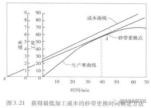 决定何时更换砂带以获得较低的单件成本的简便方法是绘制一张如图3.21所示的简图,图中成本曲线是从试验结果获得。生产率曲线表示不同时刻加工的零件数目。